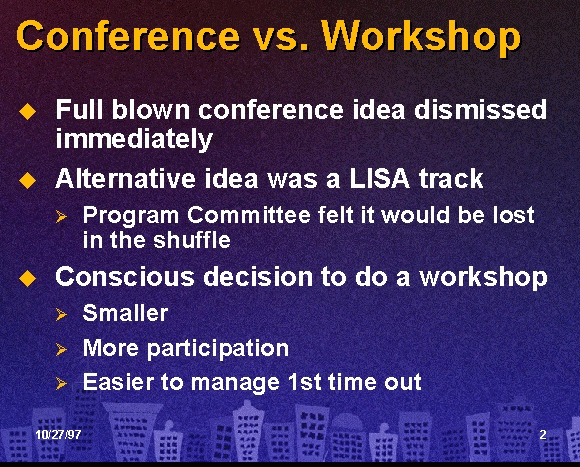 What was our thinking? (or better yet what WERE we thinking?!?!?) We didn’t want a full-blown conference right off the bat since none of us had ever done this before and USENIX is only beginning to dabble in NT.
