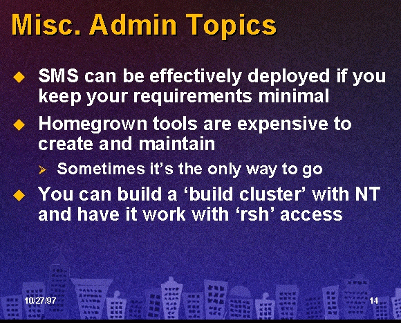 Remy Evard presented the final paper on building NT build clusters. His experiences with creating these clusters demonstrated some of the real limitations of large scale NT deployments. Most of the remote access products on the market won’t scale to 1000+ machine environments. More needs to be done to make NT useful from the command line (but more on that a little later).
