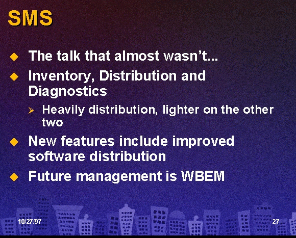 SMS is a product that everyone needs but no one really likes. Most folks buy it to do software management. Well, it will do that… sort of. It’s much better at inventory. But there are new technologies emerging which will extend the functionality of SMS in the arena of software distribution.