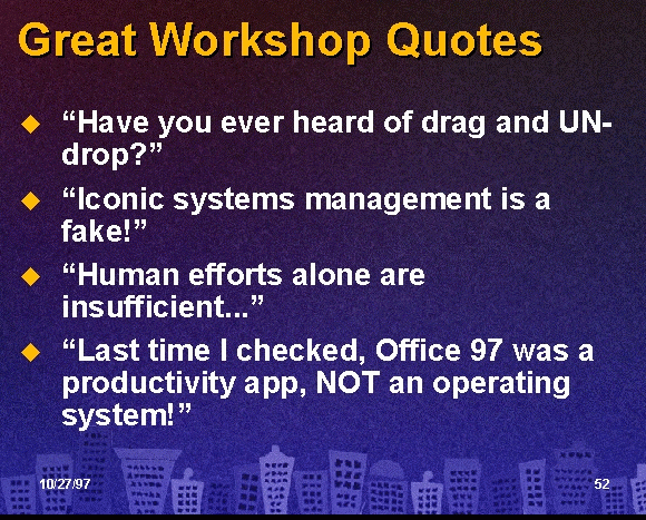 One of the jobs that the program committee handled was to listen to the participants during informal conversations and collect really good quotes from people. Here then, to wrap this all up, are the great workshop quotes...